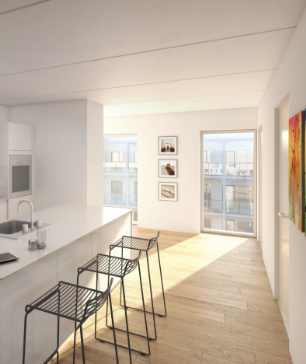 Lejlighederne består af et stort køkken-alrum med et tidløst HTH køkken med AEG hårde hvidevarer samt smukke og meget slidstærke laminatgulve med god akustik.